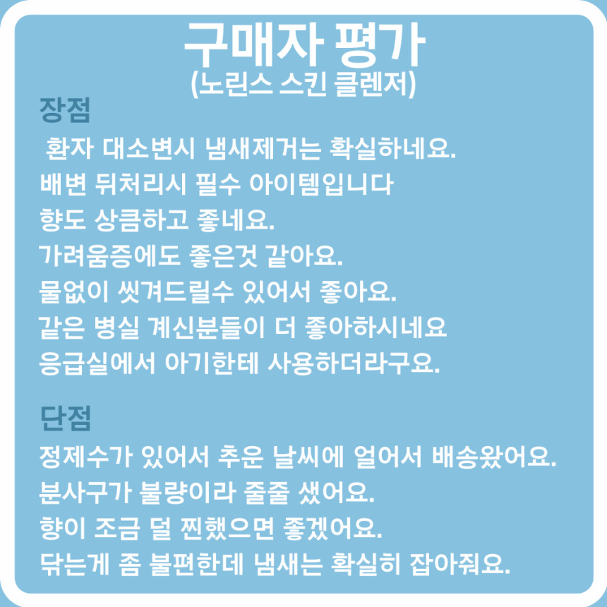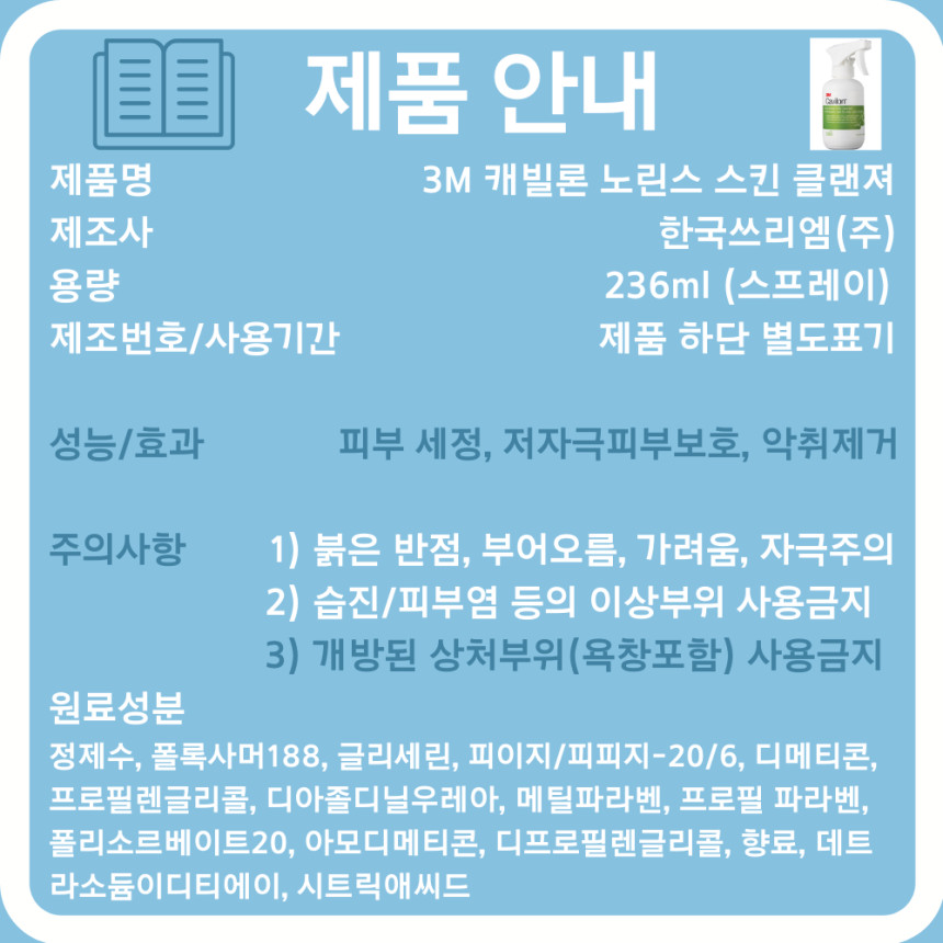 | [간병용품세트] 3M 캐빌론 노린스 스킨 클렌저 (대소변 냄새제거, 욕창예방) (0) | 2021.04.12 |